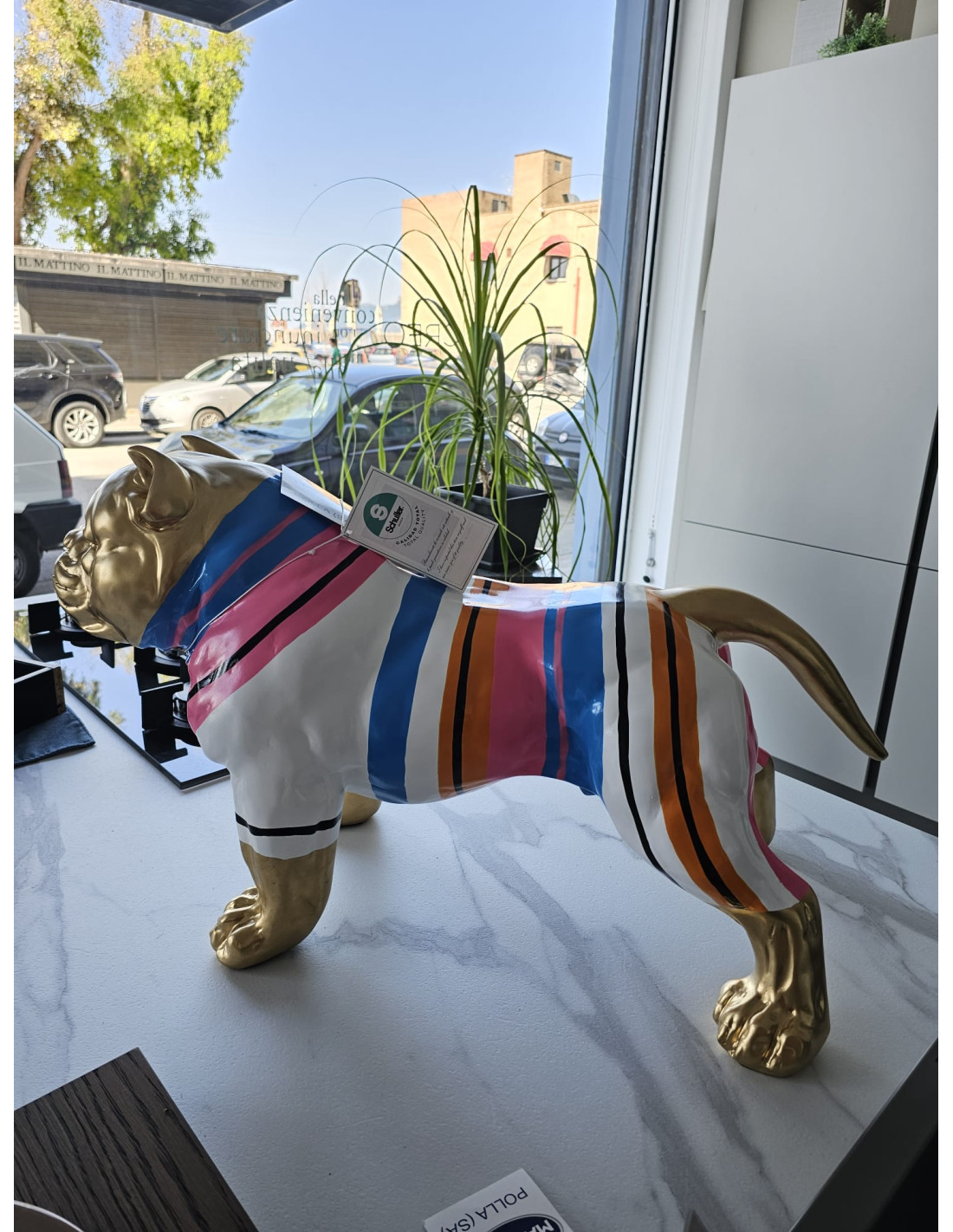 La figura è stata sapientemente dipinta a mano con una sofisticata vernice dorata, arricchita da righe colorate che conferiscono un tocco di vivacità e dinamismo al design.