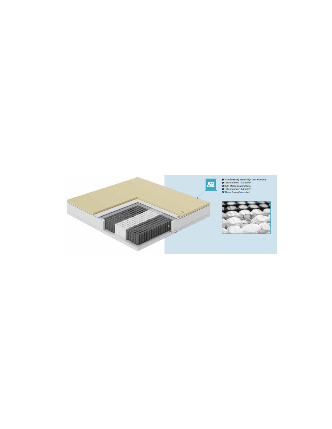 - Strato superficiale (lato invernale) in Memory Waterlilly®, ad alta densità, che assicura un elevato comfort e conserva l'elasticità e la forma originale anche dopo svariati anni di utilizzo.