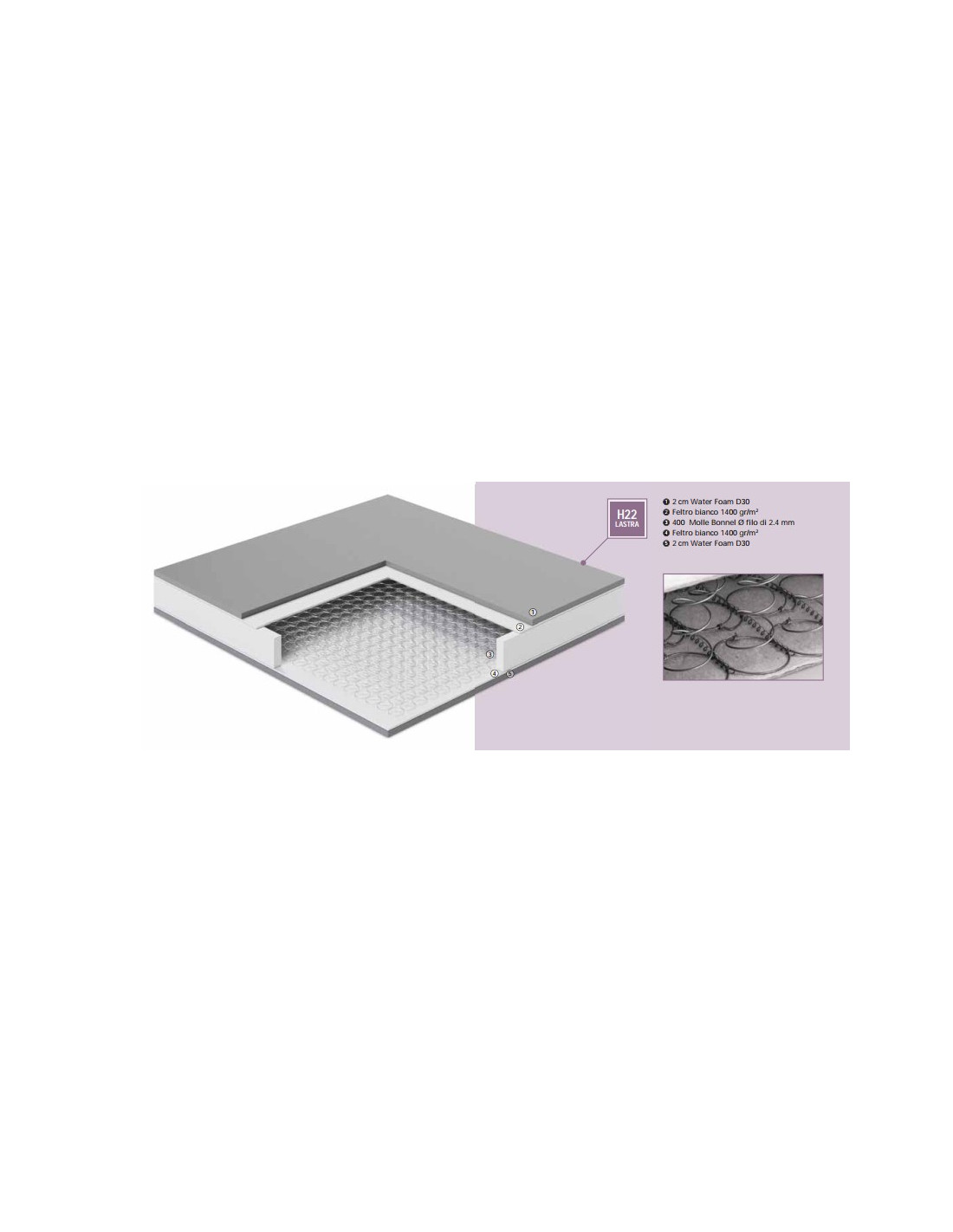 1. /5 Strato superficiale in Water Foam, una schiuma ad alta densità a base di acqua e a cellule aperte, altamente traspirante e in grado di fornire un supporto ergonomico.