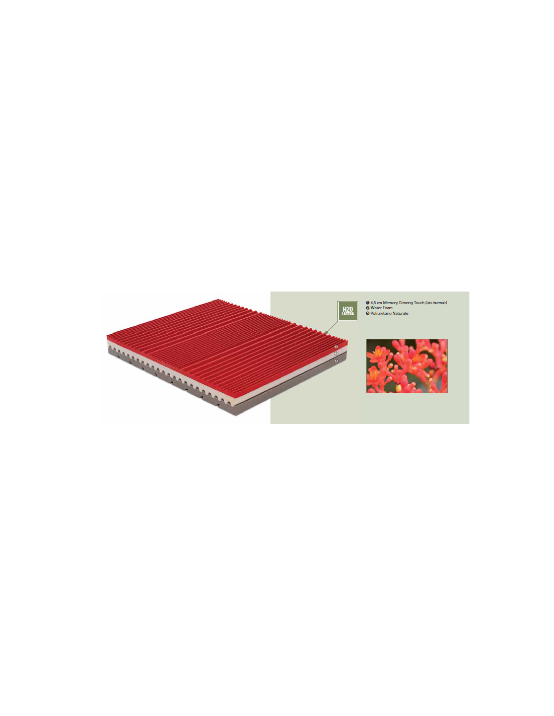 - Strato in Memory Ginseng, schiuma evoluta a lento ritorno a base di acqua, schiumata con olii vegetali e arricchita con olii essenziali di Ginseng. Questo particolare materiale garantisce un riposo rigenerante, idrata i tessuti in modo naturale ed è termoregolatore.