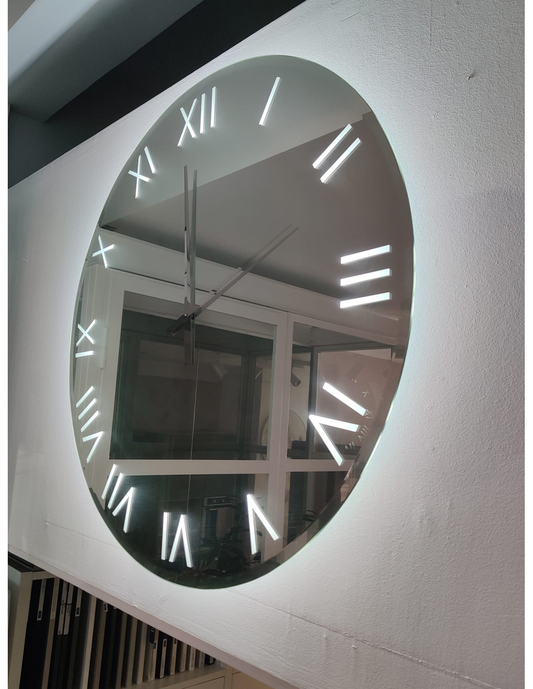 La cura nei dettagli emerge attraverso la realizzazione di un orologio a specchio in pregiato vetro dallo spessore di 5 mm, che aggiunge eleganza e sofisticazione all'ambiente circostante.